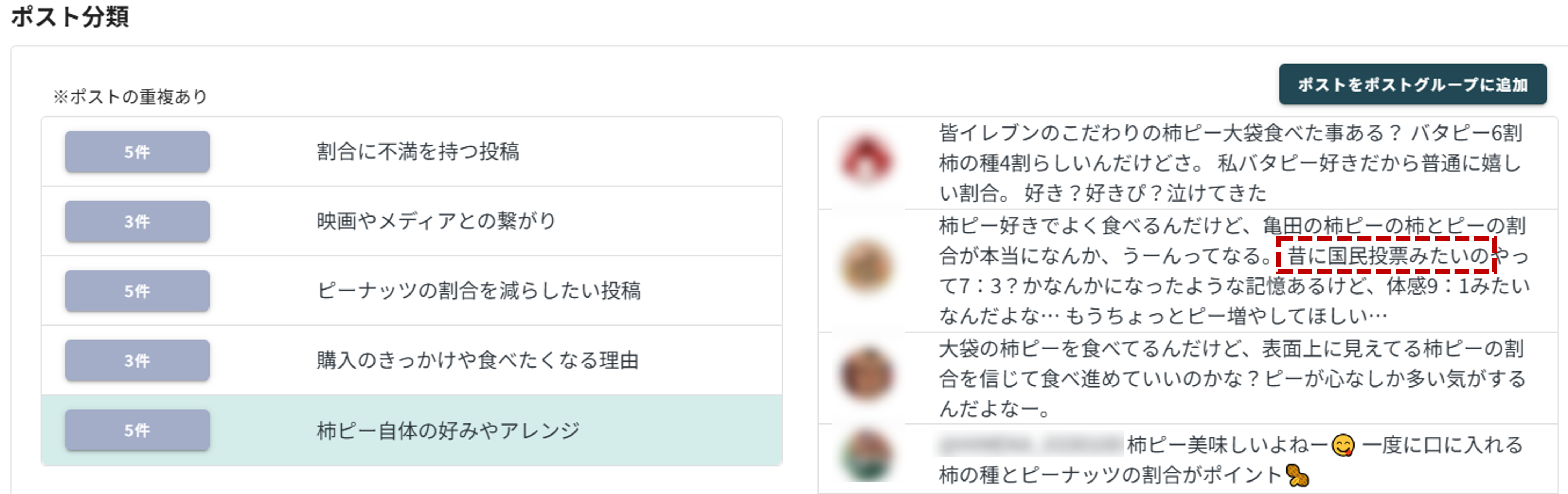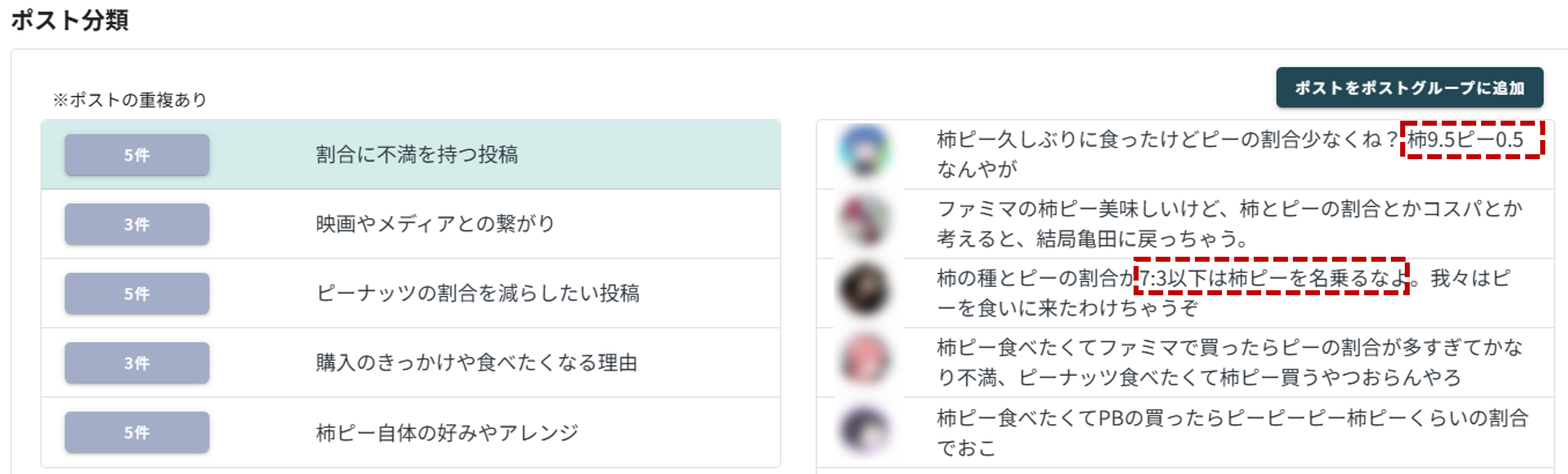 「ピー」がなぜ更に繰り返されてるのかがわかりました。「ピーが食べたい=ピーナッツ派」が居たり、柿ピーとしての「柿の種とピーナッツの割合」に言及しているユーザーが居るからですね。