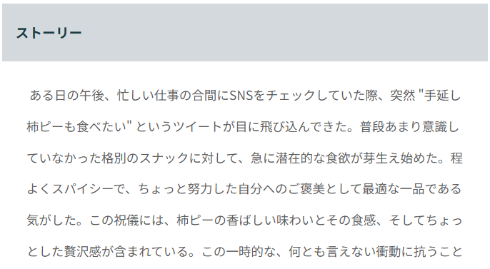 「手延し柿ピー」というちょっとお高い商品に出会って食べたくなる、そんな内容ですね。