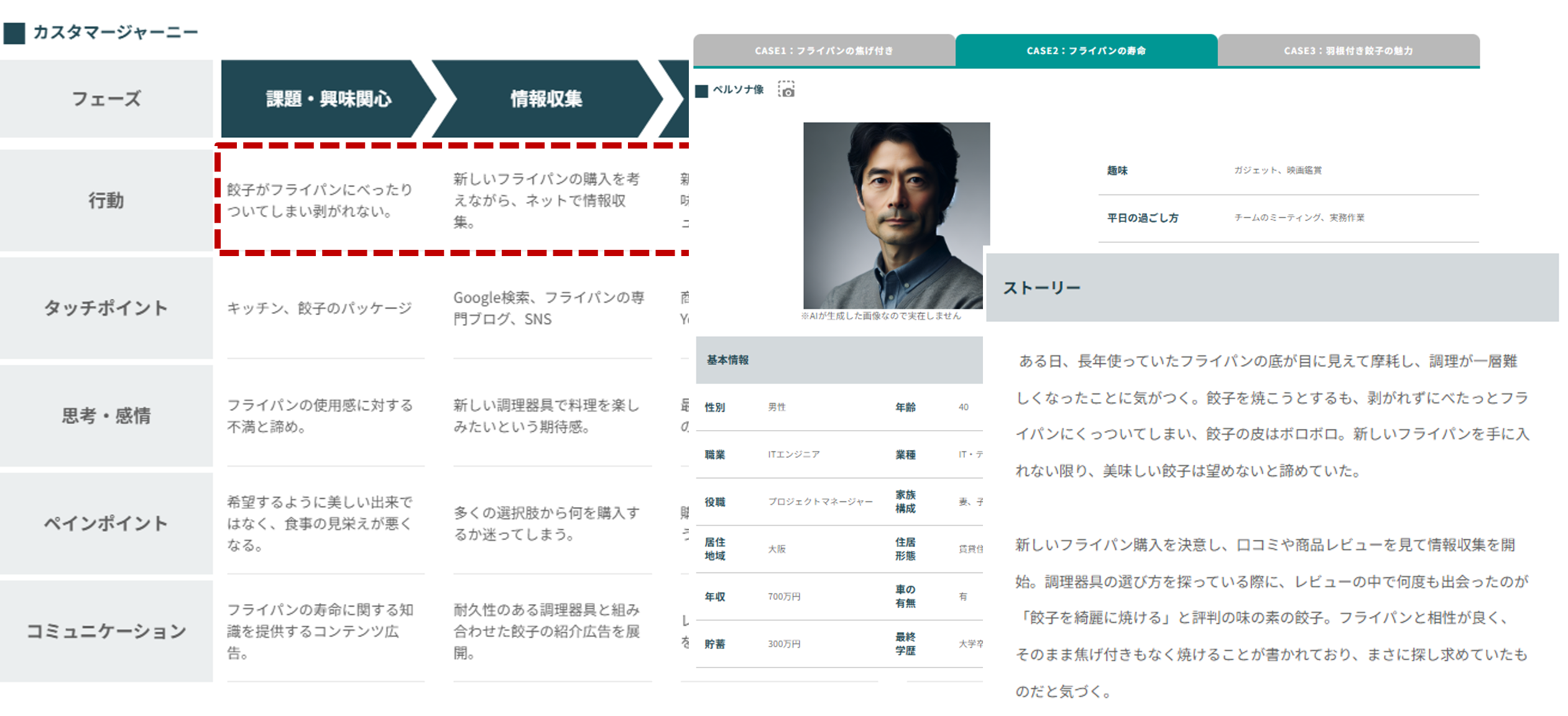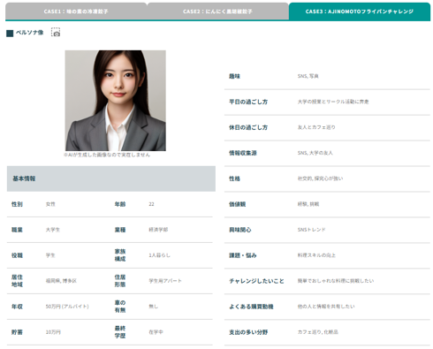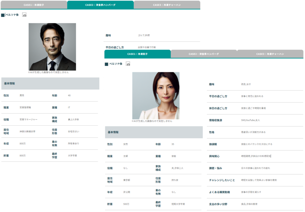 まずは広範に、どのような人が味の素の冷凍食品を活用しているのかをHAKURAKUで分析しました。 表示されたペルソナを見ると、仕事に忙しいビジネスマンから主婦まで幅広く愛用されていることがわかります。