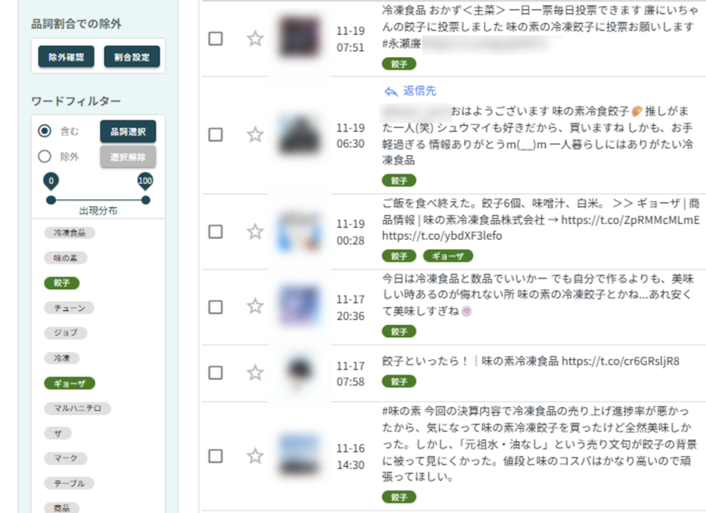 ワードフィルターで上位に出現している「餃子」や「ギョーザ」に絞り込んでみると、「餃子と言ったら味の素」「味の素の冷凍食品の餃子 大好きです」といった、ファンによる熱量の高い投稿が目立ちます。