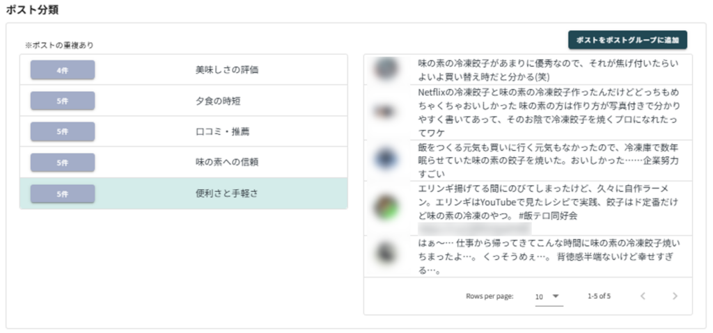 続いて、人気の秘密を探るために「”味の素” “餃子”」で再分析をかけました。 ポスト分類を見ると、「夕食の時短」や「便利さと手軽さ」といった文脈が並びます。味がおいしいのはもちろんですが、「水・油いらず」という革新的な調理法が、ユーザーの生活に深く浸透していることがわかります。