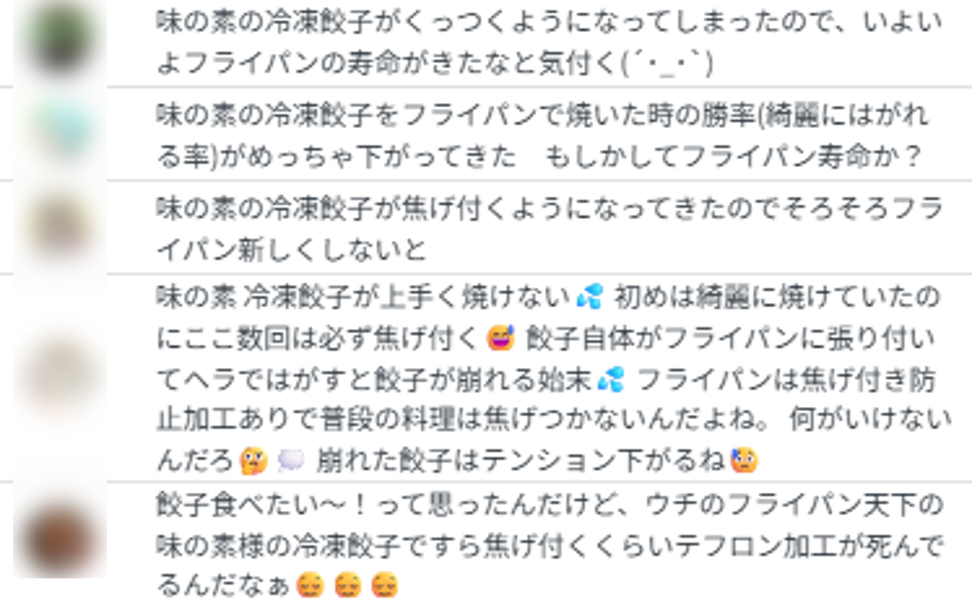 ただ、なかには味の素の餃子でさえ、焦げ付いてしまうという投稿も。これほど徹底した改良が行われているのに、なぜ今も「焦げ付き」が言及されるのか? 疑問を解くため、HAKURAKUで現象に絞った深掘り検索を行いました。