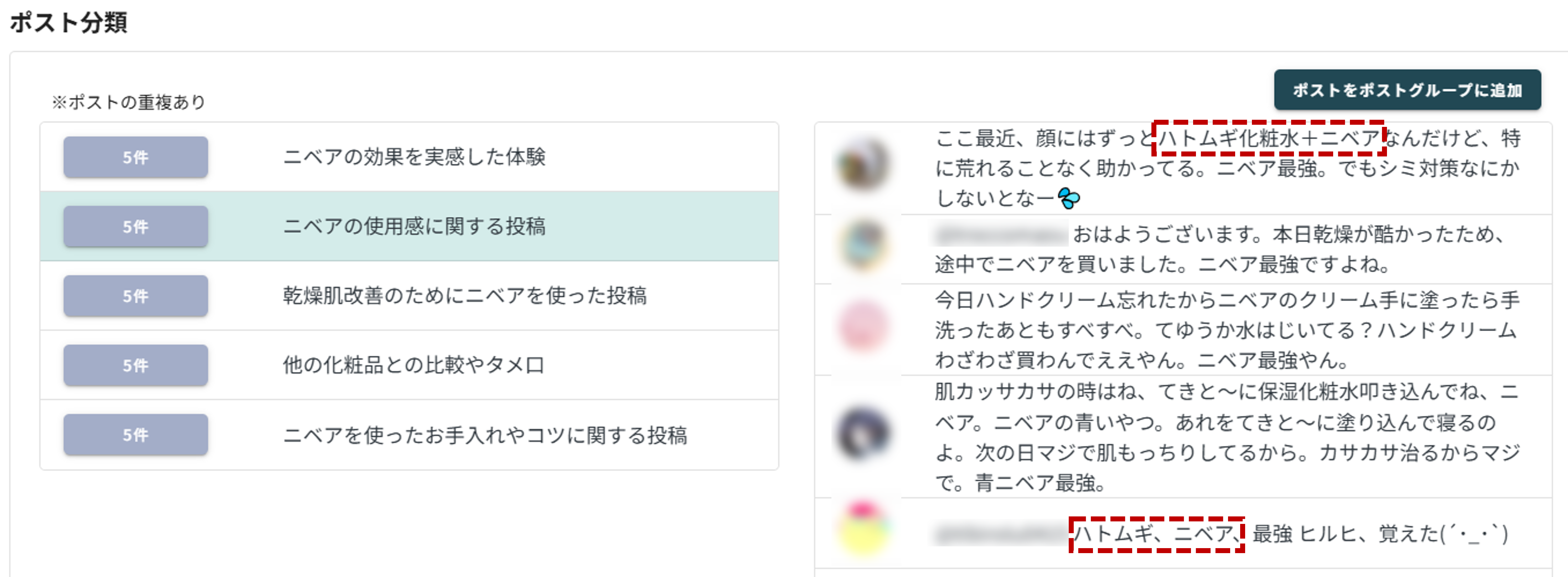 使用感に関するポスト分類では、「ハトムギ化粧水」との組み合わせに言及しているユーザーがいますね。これも長年のロングセラー商品なので、相性が良いのかもしれません。