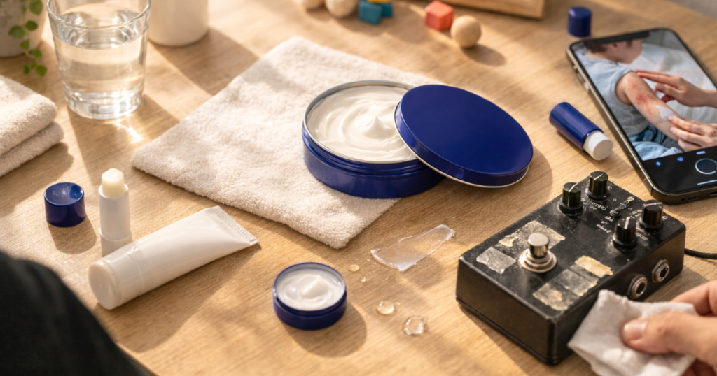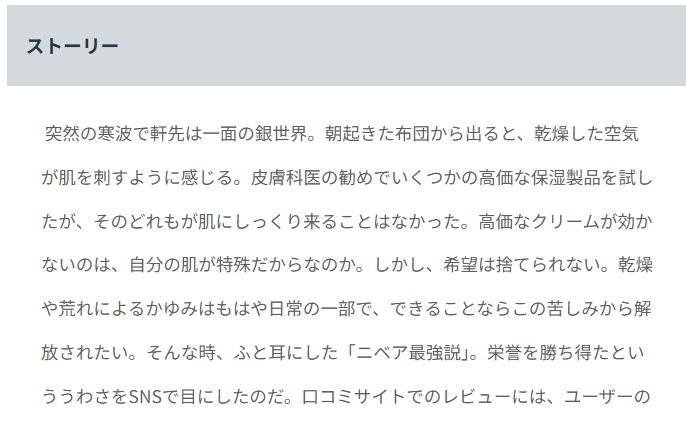 ニベアほどのロングセラー商品であれば、ブランディングとしてイメージを破壊するような突飛なことはできないでしょう。かといって、昔の商品だからと軽視されてしまう側面を打破したい、そんな相反するジレンマも抱えているかもしれません。個人的にはエフェクターの件であった、「市販のシール剥がしだとプリントまで消えちゃうけど、ニベアだと綺麗に取れる」っていうのが、保湿用品としても「効果的だけど優しい成分」みたいなことに変換して言えるんじゃないかな、と妄想しちゃいます。