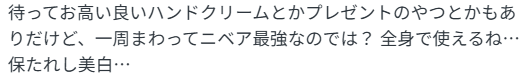というわけで「”ニベア最強”」です。っていきなりなんだって感じですが、SNSで投稿されるつぶやきって、こういう言い回しから面白いものが見つかるケースが多いです。他には「”ニベア神”」とか。